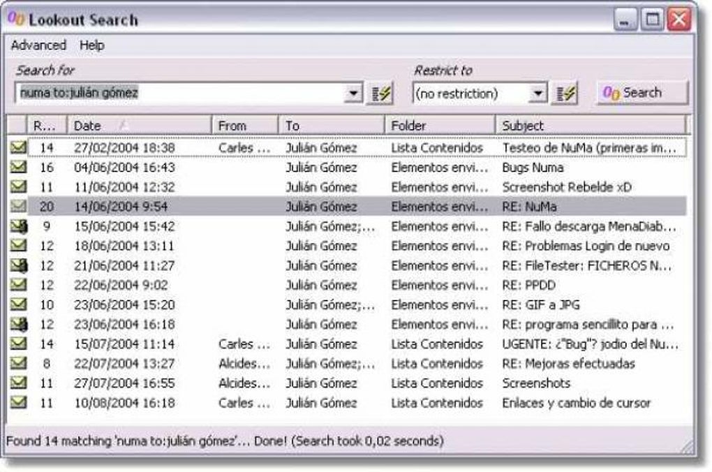 El potente buscador se basa en un índice creado previamente por el propio programa y que incluye todas las carpetas, mensajes y demás elementos que quieras. Gracias a esto, las búsquedas son rapidísimas y engloban no sólo los correos electrónicos, sino también la agenda de contactos, el calendario, las notas, las tareas, o incluso cualquier otro fichero almacenado en tu PC.